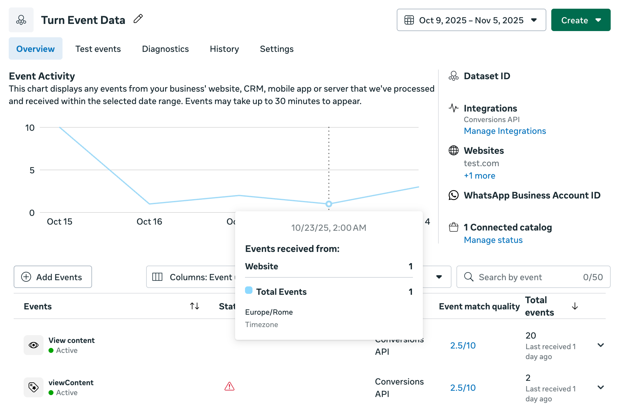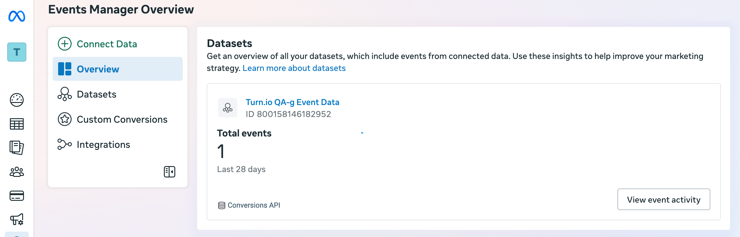 The Turn.io Conversions API integration automatically connects to the existing Meta dataset for the Conversion API linked to the Organisation’s WhatsApp Business Account (WABA). If no dataset exists, it creates a new one.