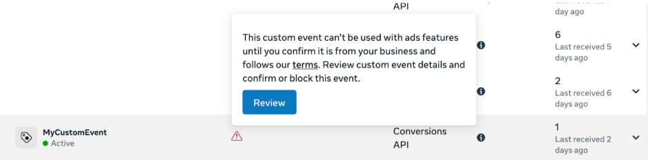 NOTE: When adding a new custom event into the Conversions card, it will be sent to Meta where it will need to be reviewed and approved in the Events Manager before being available for tracking: