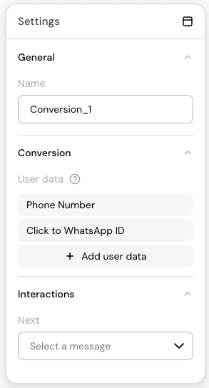 - Optionally available is the ability to further enrich the data you send back to Meta with User data. While configuring your Conversion card, click on the Settings panel on the right to access and choose more User data: