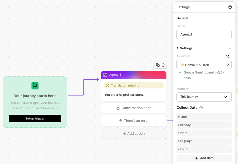 When building a Journey and selecting an Agent, a new Collect Data section appears in the right-hand sidebar. Here, you specify exactly what information you want the Agent to gather—a phone number, preferred appointment time, medication list, pregnancy stage, or anything else relevant to your journey.