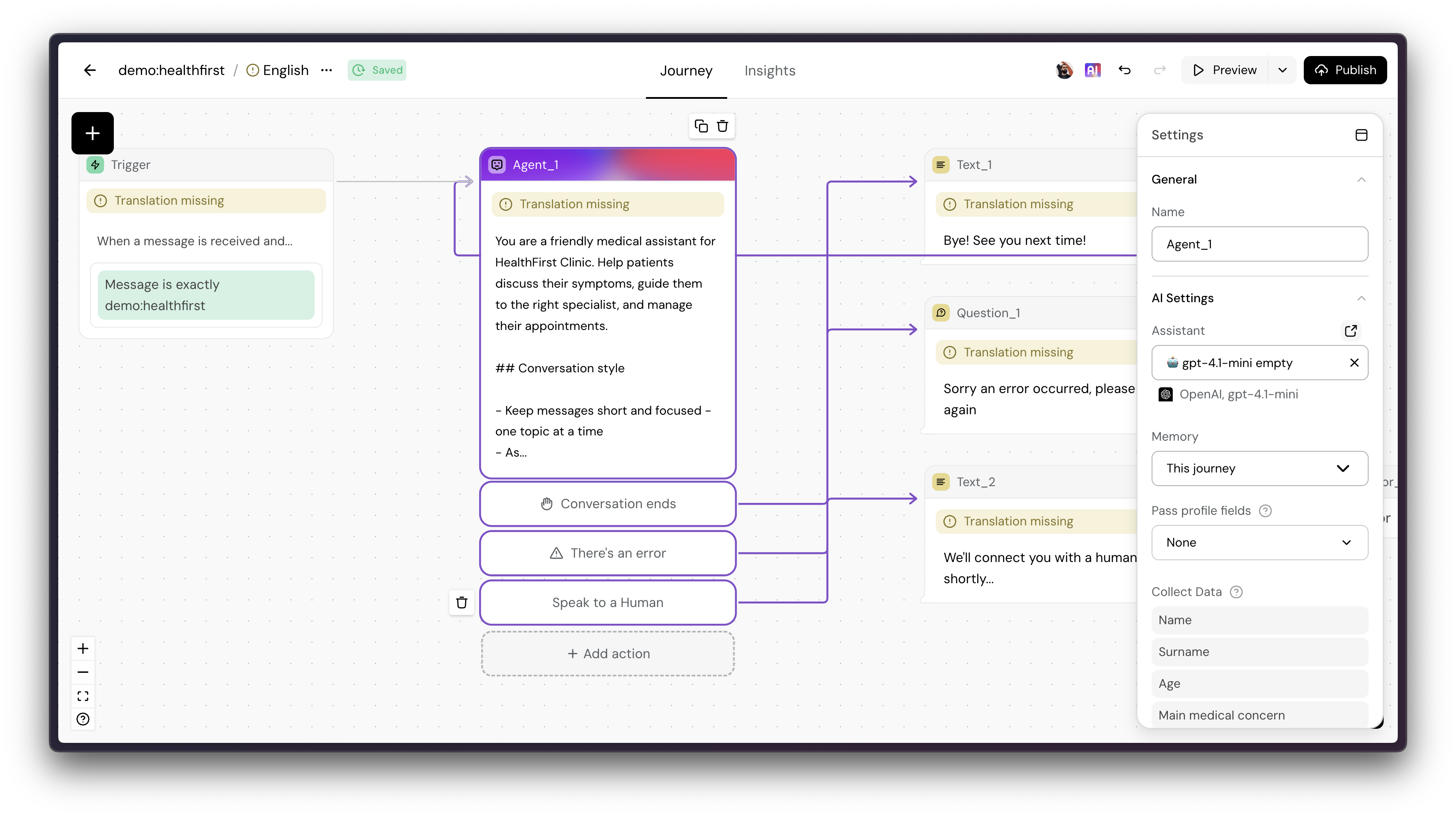 - Agentic workflows: connect multiple specialised Agents to each other (tip: if you're doing this, we recommend having a "router" agent that routes the user without replying, that all sub-agents connect to)