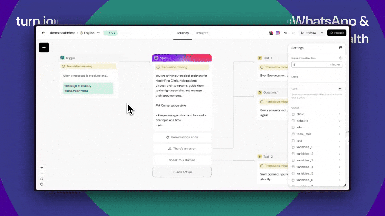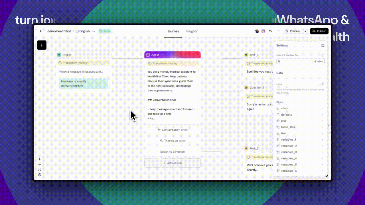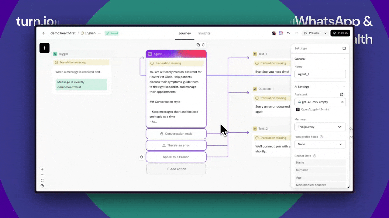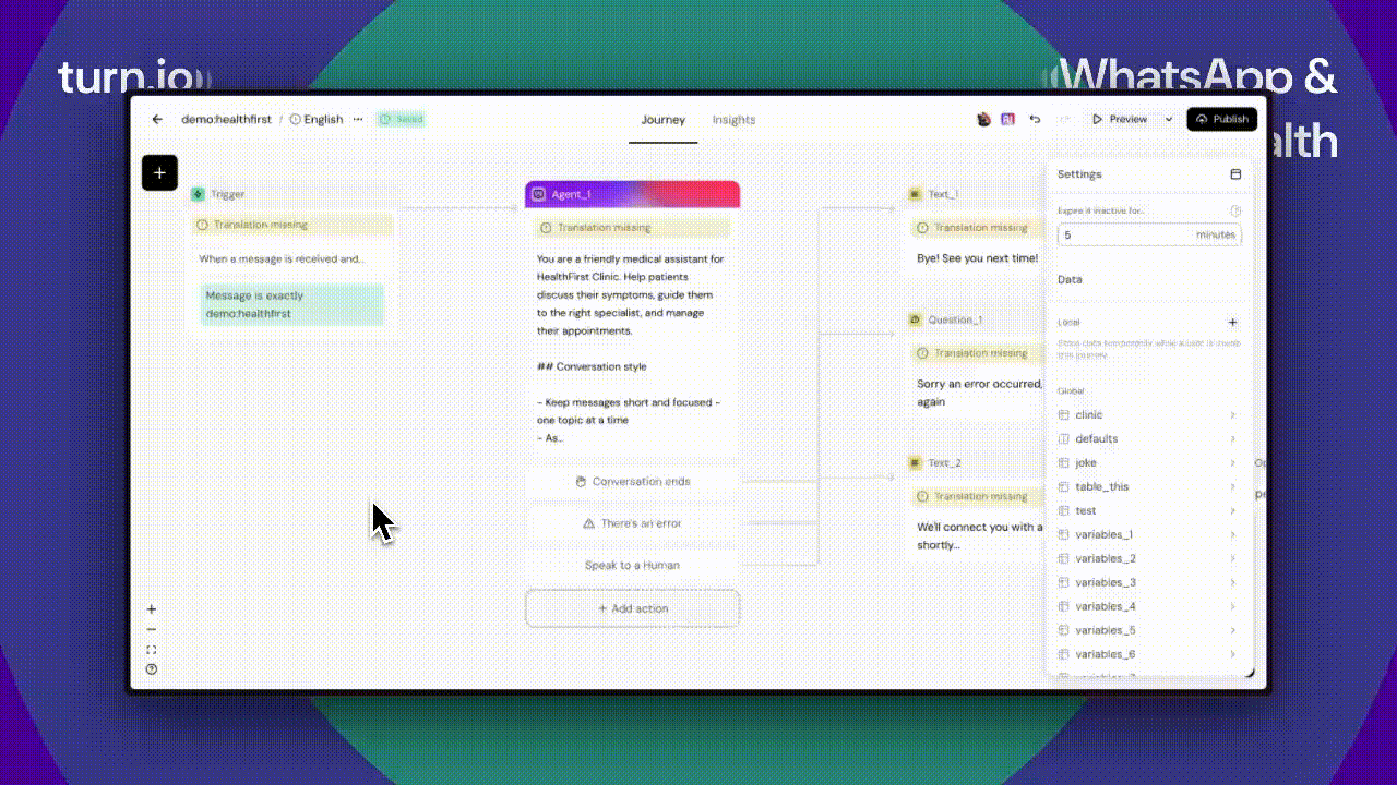 The Agent card is the most powerful way of building with Turn.io today. All of these small features, in combination, enable you to build extremely rich and high quality AI-powered conversational experiences.