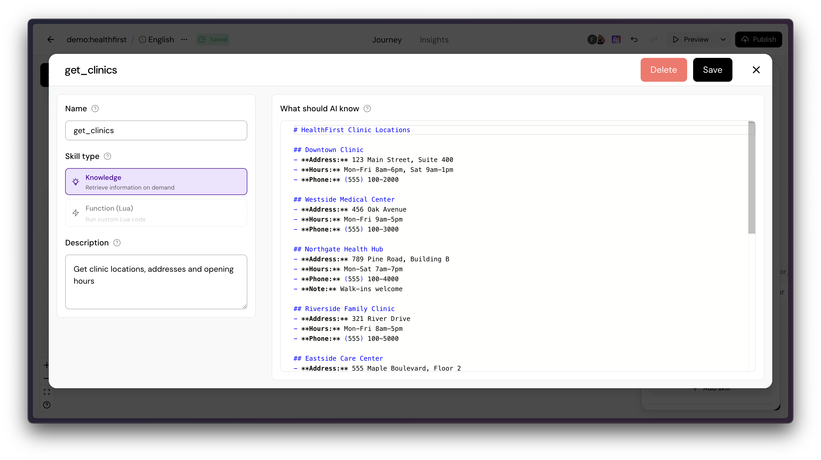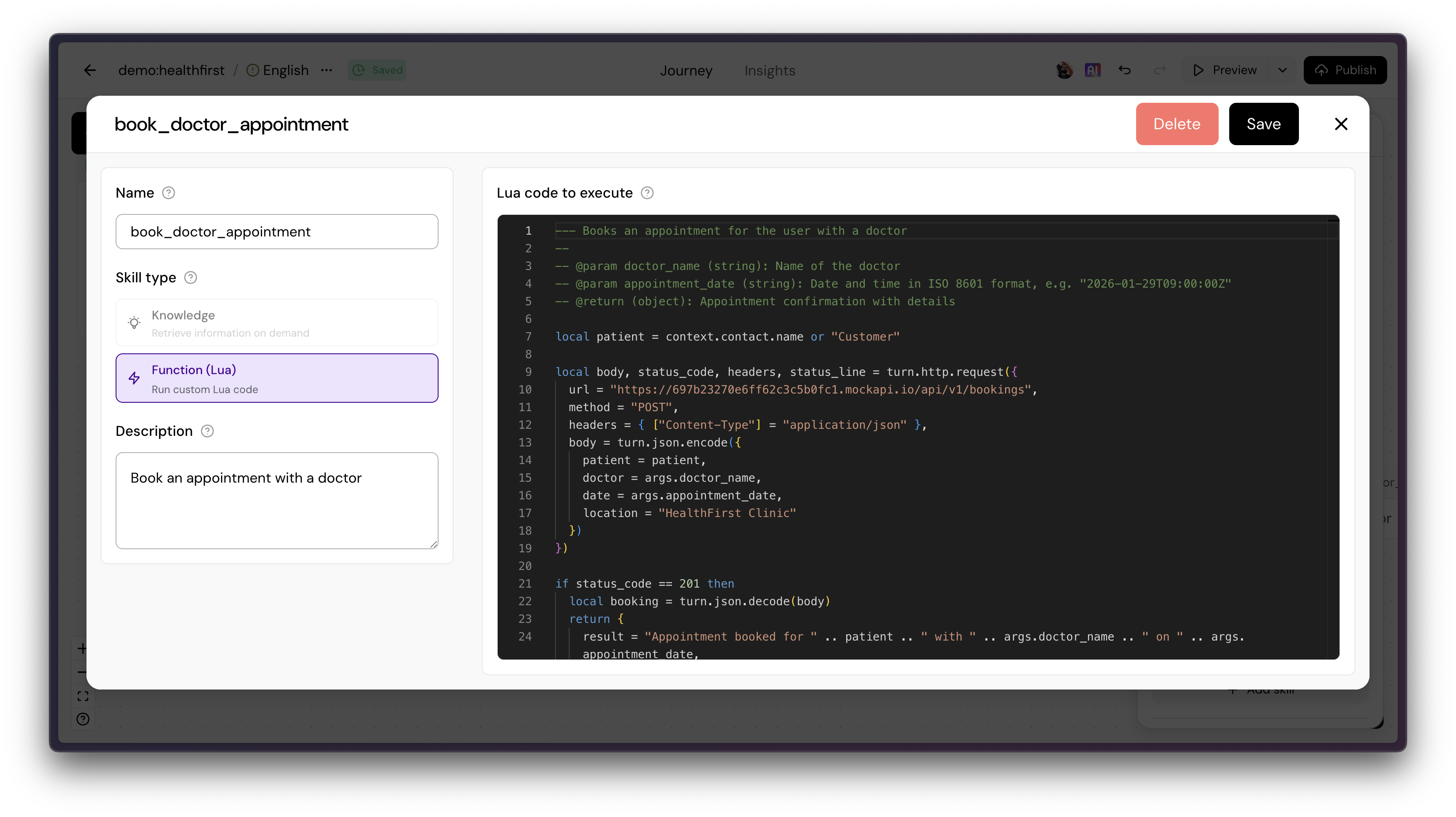 Want it to autonomously book an appointment into your system? Or retrieve a list of doctors and their availabilities? Or get the current weather? Simply build a Function Skill for your Agent, and they'll autonomously use it whenever they need them