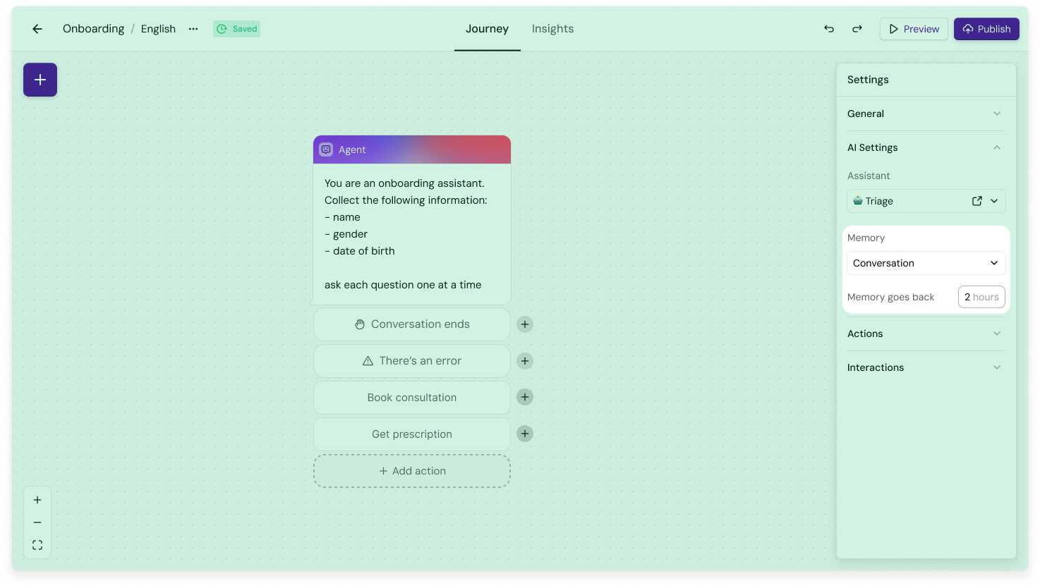 Both Agents and Conversation Memory are available to all Turn.io customers starting today. You'll find the new Agents block in your Journeys builder, and Conversation Memory can be enabled in the Agent's settings.