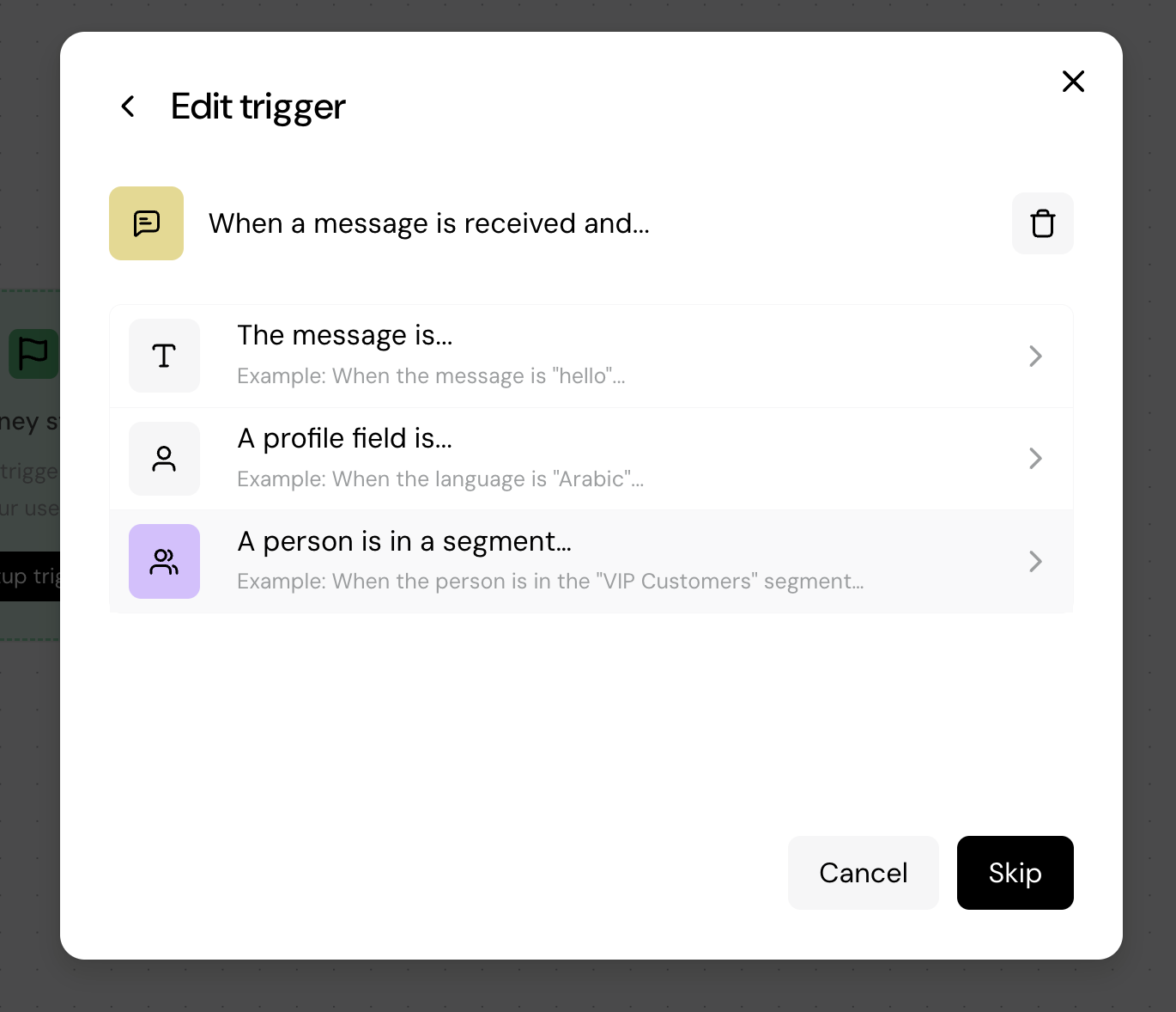 Start a journey when a message is received, but only for people in a selected segment (e.g. “VIP customers”, “Trial users”). Everyone else is ignored.