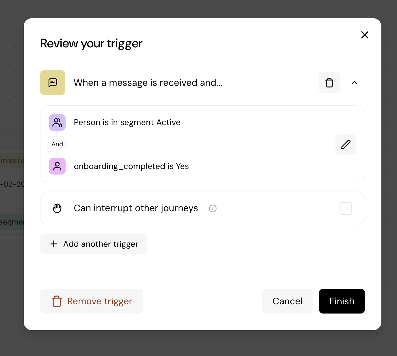 - In the journey canvas, the trigger is shown with the segment name and audience size so you can see at a glance who the journey targets.