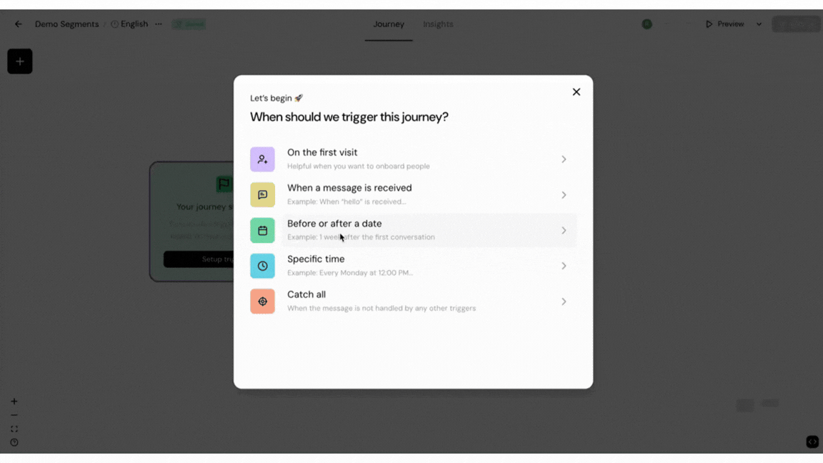 When a trigger fires (for example “message received” or a scheduled time), the journey runs only for contacts in the chosen segment, so you can target pre-defined audiences more precisely.