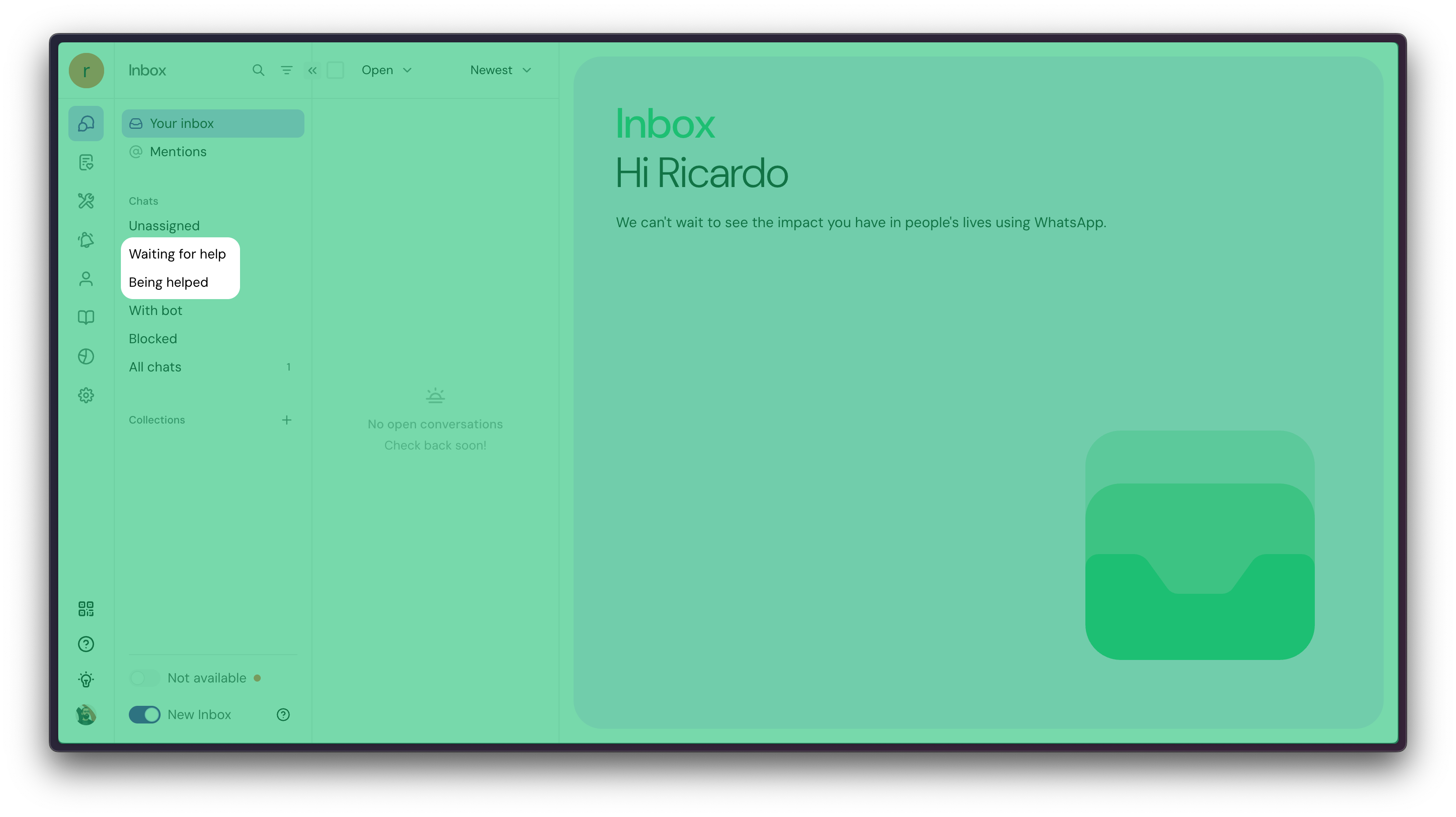 Welcome to your Inbox — the heart of real-time support in Turn.io! Whether you're engaging with a new contact, resolving a user question, or organizing conversations for your team, Inbox gives you the tools to manage conversations at scale with clarity and ease.