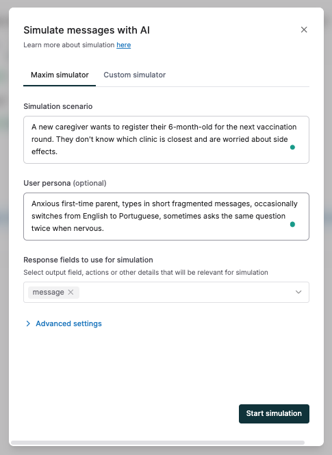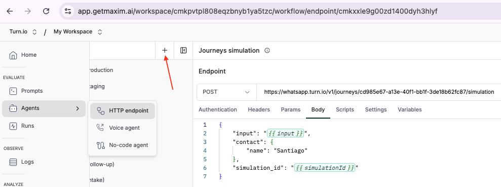 - In Maxim, navigate to Agents → HTTP endpoint and click New Simulation.