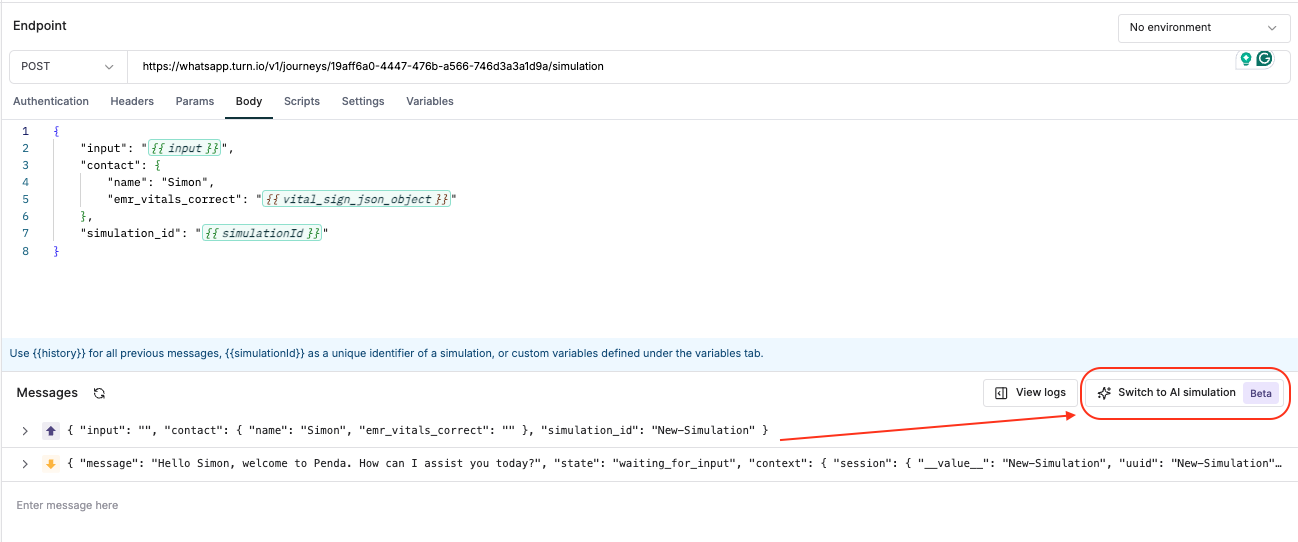 Now, send a first message to check everything is well configured. After manually sending a message and getting a response, you'll be able to see the Switch to AI Simulation button: